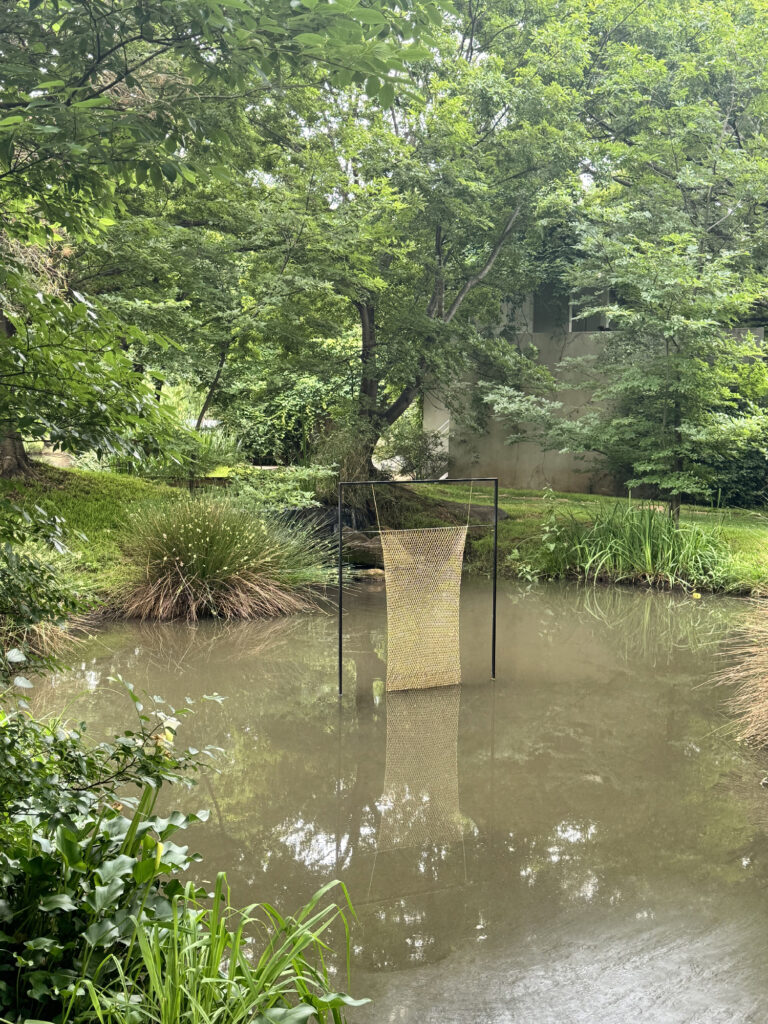 The net reflects one of the earliest human technologies: an ancient tool that extended humanity’s capacity to catch, gather and carry, providing the roots of a later-inflamed anthropocentric technological evolution. The gold threads used in the installation are sourced from traditional European manufactories that recycle gold circulating within Europe, originally extracted from various parts of the world and used in gold-decorated objects. By returning this gold to South Africa and building an unusual relationship between water and gold, the work invites reflection on the politics and enduring consequences of value assigned to materiality.